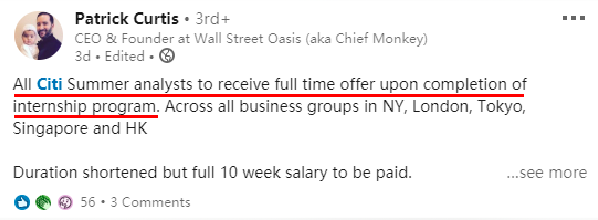 。去年Citi甚至宣布所有的暑期实习生都会收到Return Offer!转正几率提升至100%!