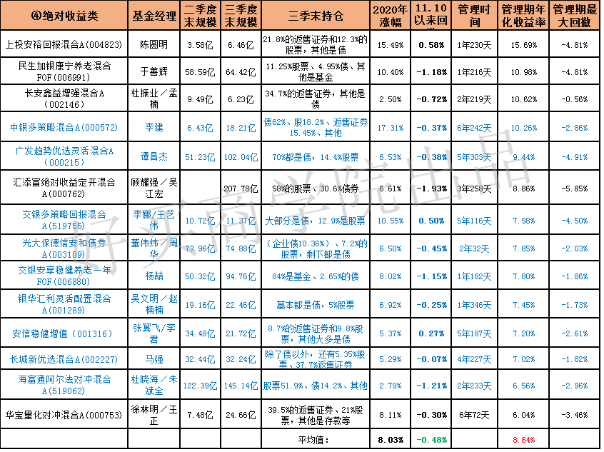 再看历年收益,筛选出重点关注的绝对收益类基金,在2014-2020年以此获得5.45%、21.18%、4.65%、9.72%、3.51%、10.92%、7.70%。而且现任基金经理的管理期最大回撤都在5%以内。