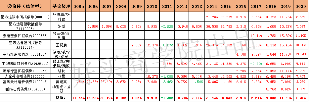 再看历年收益,筛选出重点关注的偏债基金(中低波动型),在2005-2020年以此获得11.56%、14.62%、20.19%、6.15%、7.06%、9.91%、-1.35%、10.20%、2.17%、21.43%、16.58%、2.91%、5.67%、4.09%、11.20%、7.97%。而且现任基金经理的管理期最大回撤都在9%以内。