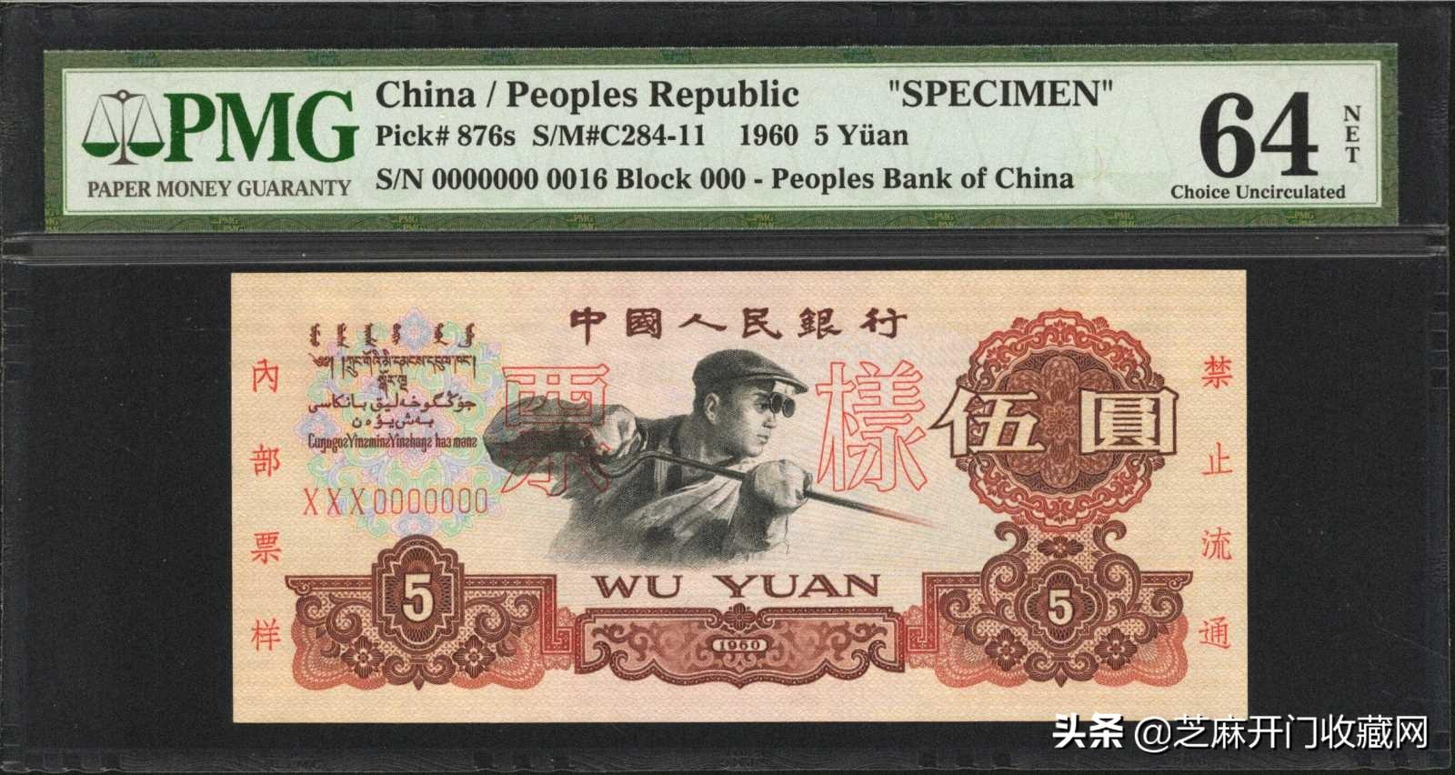 1960年第三版人民币伍圆。样票。估价: USD 700 - 1000,成交价格: USD 1140